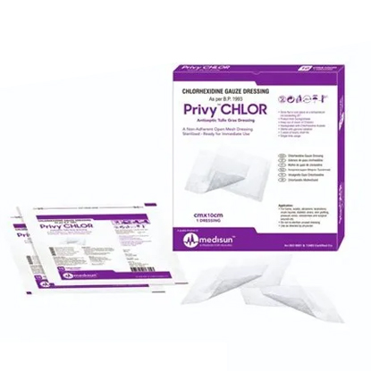 PrivyChlorChlorhexidine dressing and antiseptic tulle dressing Consist of the fabric of Leno weave of cotton, which has been impregnated with white soft paraffin. Chlorhexidine is an antimicrobial agent active against a wide range of Gram-positive and Gram-negative bacteria. It is non-adherent, non-allergenic, and gamma sterile, reducing the product's adherence to the surface of a granulation wound. Also available in various sizes.